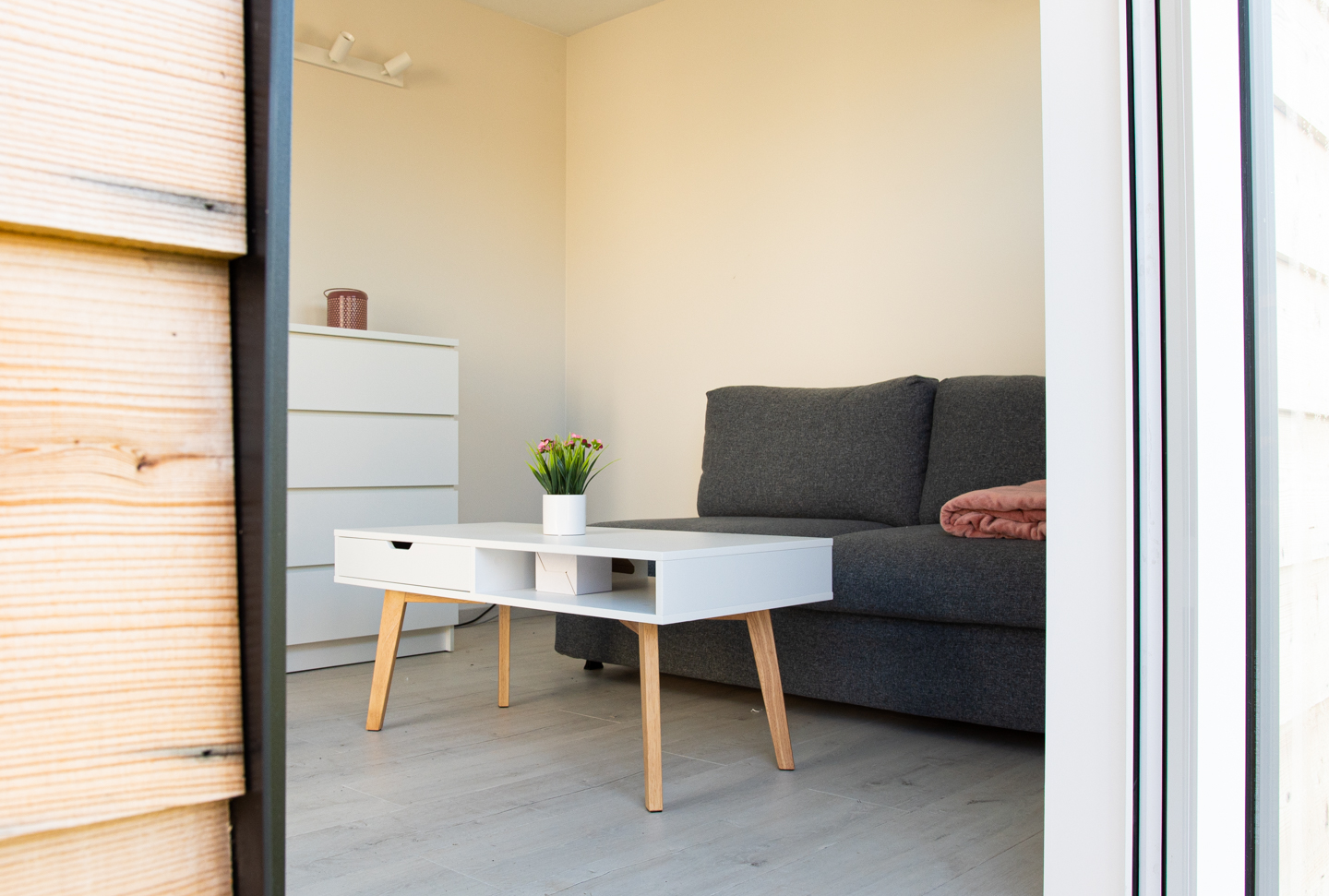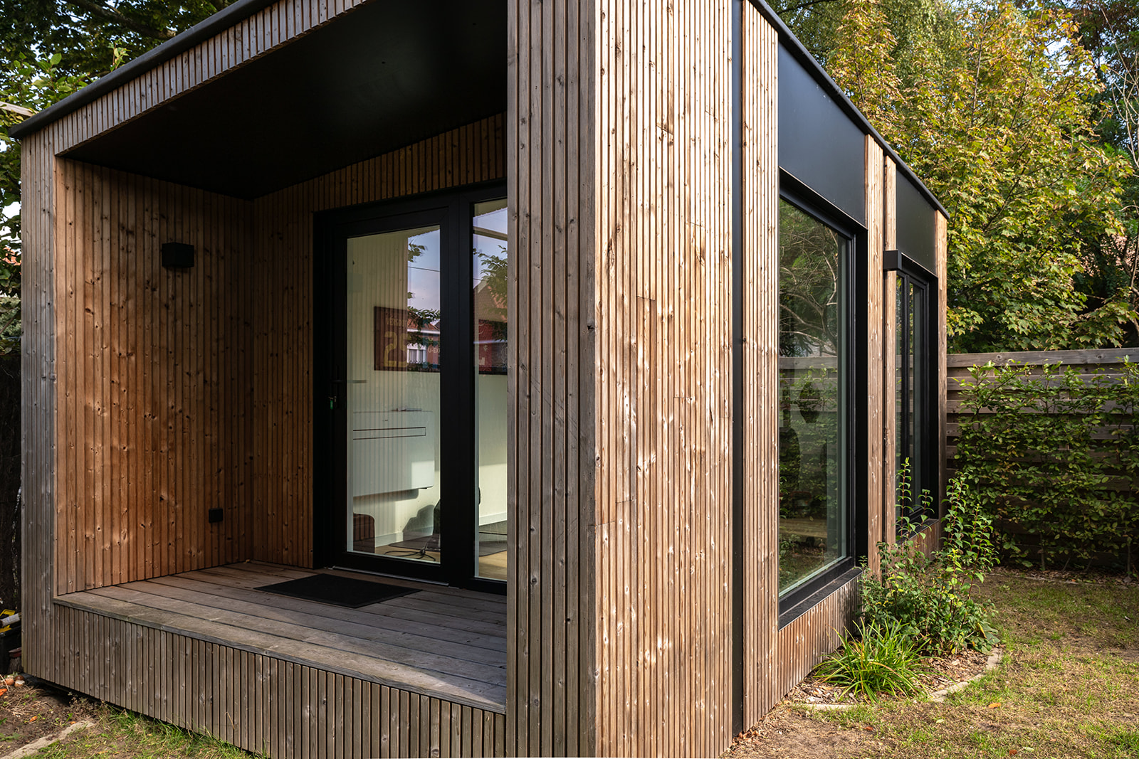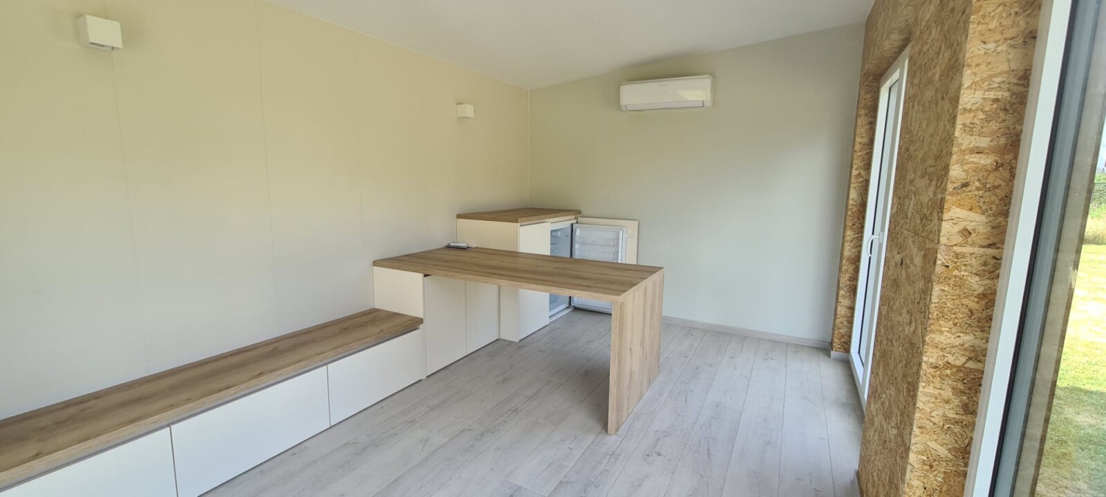 Beschrijving: “The Happy Office” is ons werkpaard: één grote open ruimte die daarenboven voorzien is van een toilet. Je kan deze cabin gebruiken als ontvangst- of besprekingsruimte.