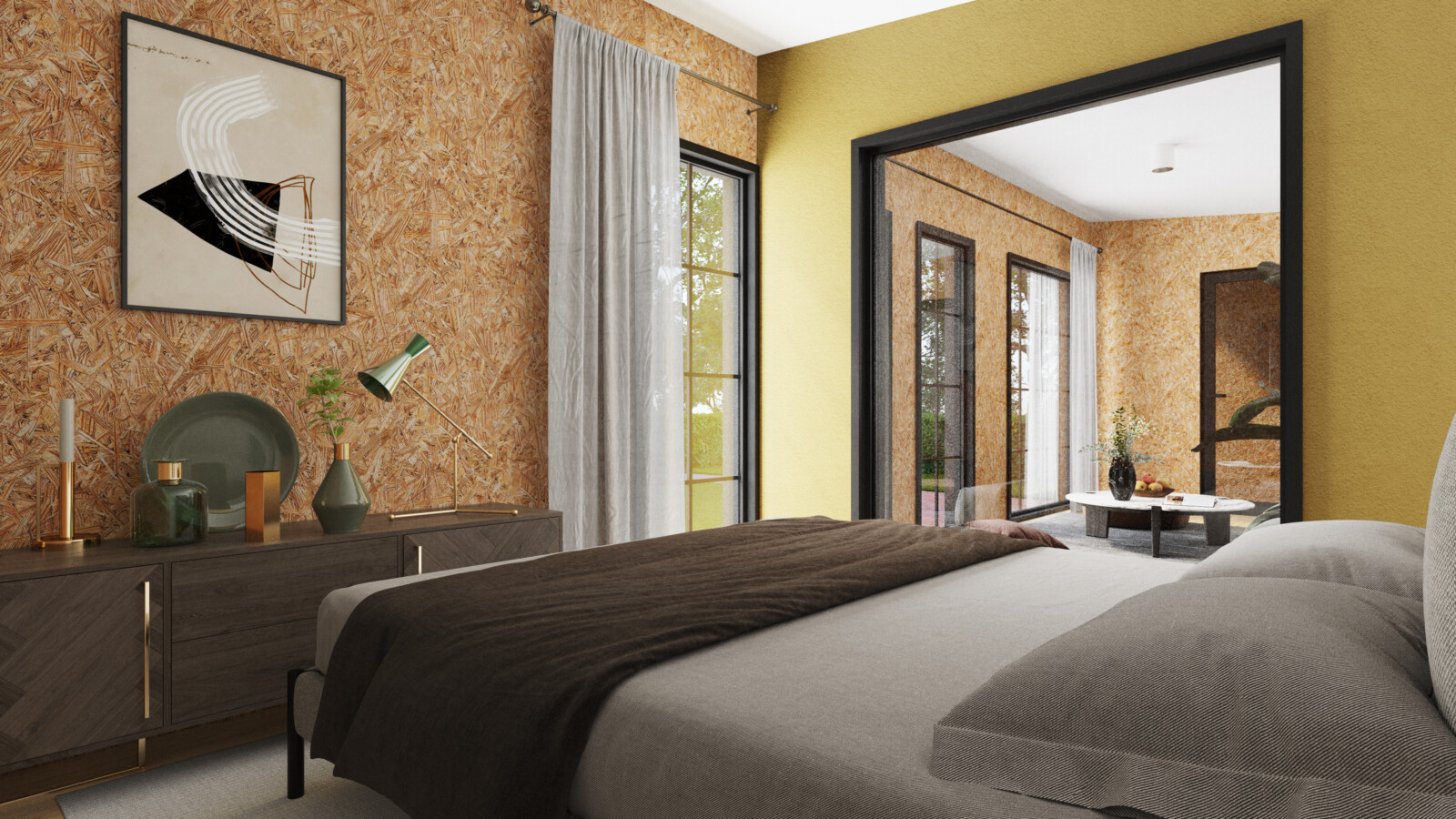 Binnenafwerking in OSB plafond (al of niet geschilderd) of een plafond van vlakke panelen. Wanden in OSB of in Clicwall panelen van Unilin met optie houttoets. Vloer in laminaatparket van Quickstep met unisound onderparket voor geluidsdemping.