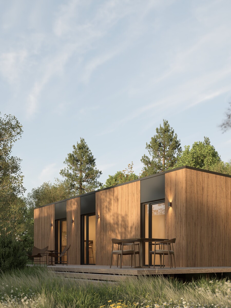 Buitenafwerking ofwel in “Cottage” met horizontale thermowood latten, ofwel in “Cubic” met verticale thermowood latten en een (eventuele) raamafwerking in zwart Trespa.
