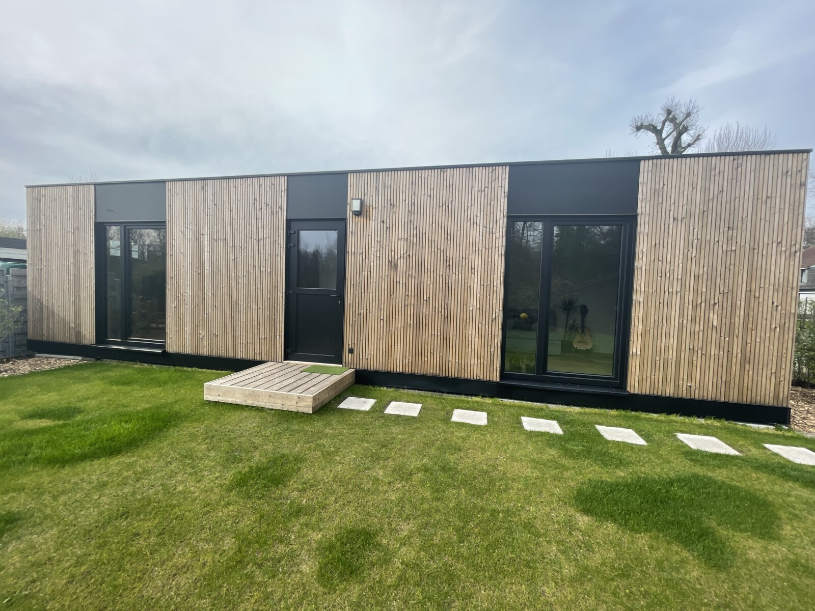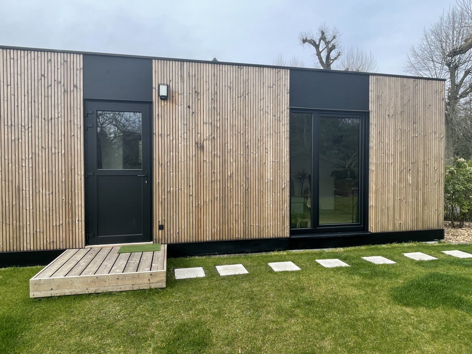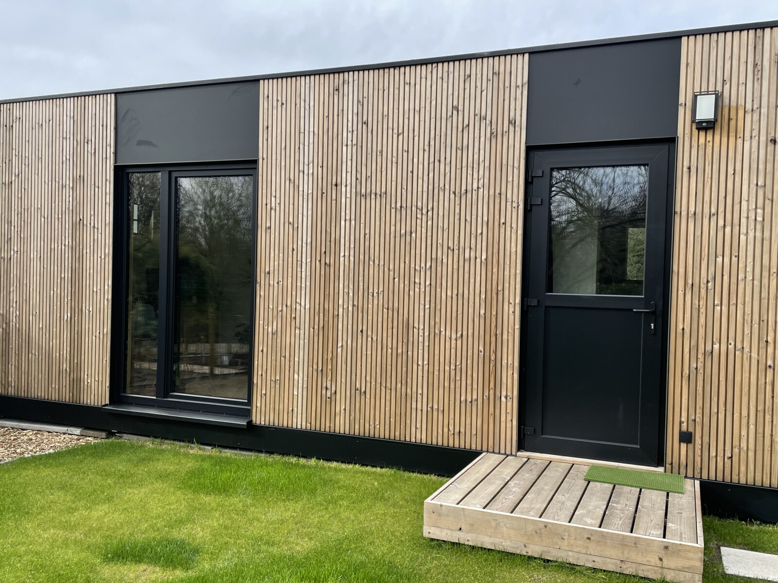 Buitenafwerking ofwel in “Cottage” met horizontale thermowood latten, ofwel in “Cubic” met verticale thermowood latten en een (eventuele) raamafwerking in zwart Trespa.