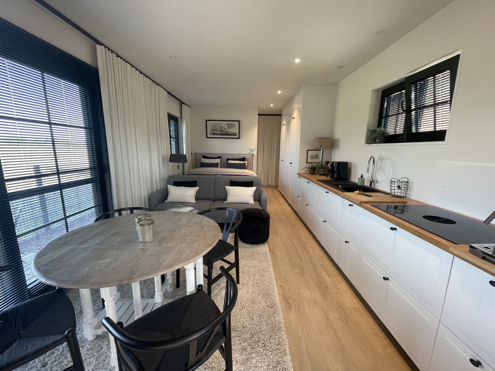 Ramen en deuren: we hebben in de standaardversie aan de kopzijde met badkamer een klein draaikipraam geplaatst, en vervolgens aan de voorzijde van de cabin één of meer draaikipramen of vaste ramen. Midden in de cabin komt aan de voorzijde een draaideur.